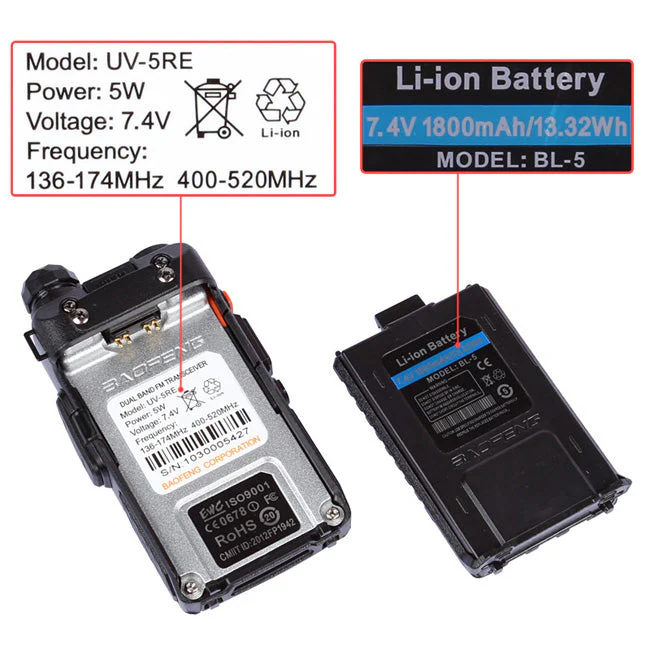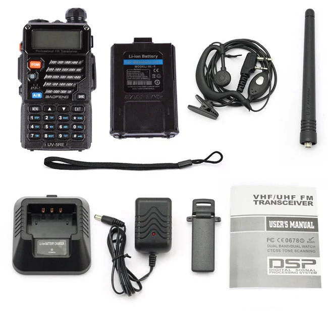 The Baofeng UV-5RE is a compact handheld radio scanner transceiver providing 4 watts in the frequency range of 136-174/400-480 MHz. It is a compact, economical HT that includes a special VHF receive band from 65-108 MHz which includes the regular FM, broadcast band. Dual watch and dual reception are supported.